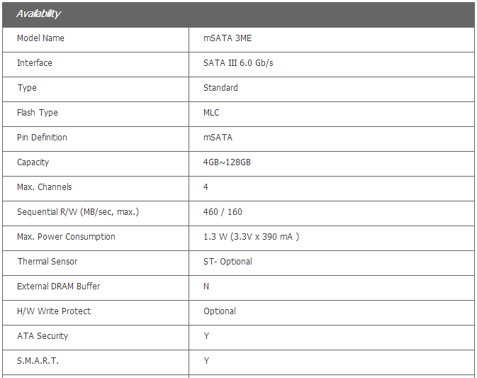 Innodisk mSATA 3ME is designed with mSATA form factor by MO-300/MO-300B which established by JEDEC, and support SATA III standard (6.0Gb/s) with excellent performance. Regarding of mechanical interference, Innodisk mSATA 3ME absolutely replaces the traditional hard disk and makes personal computer, in any field, smaller and easier. Innodisk mSATA 3ME effectively reduces the booting time of operation system and the power consumption is less than hard disk drive (HDD), and complies with ATA protocol, no additional drives are required, and can be configured as a boot device or data storage device.